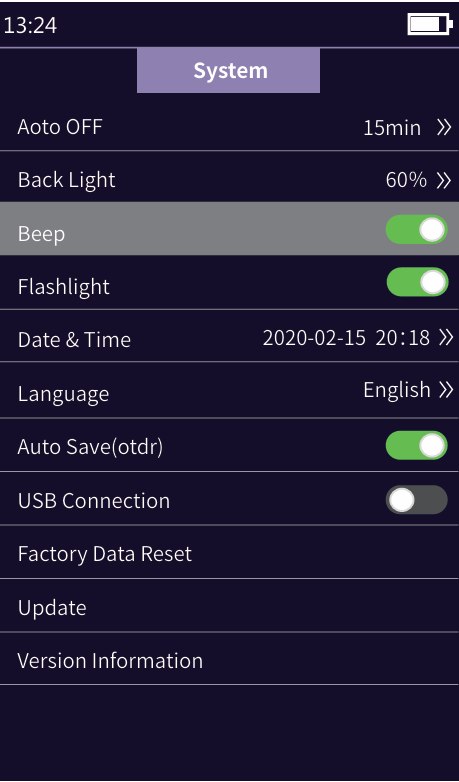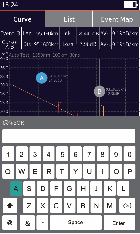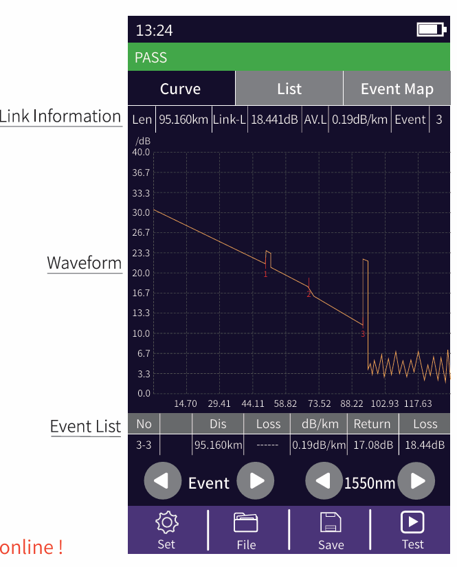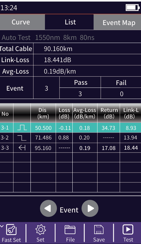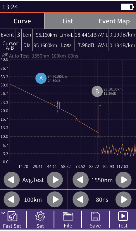 Measurement mode: OTDR scanning event mode, AutoTest/RealTest/Avg.Test
