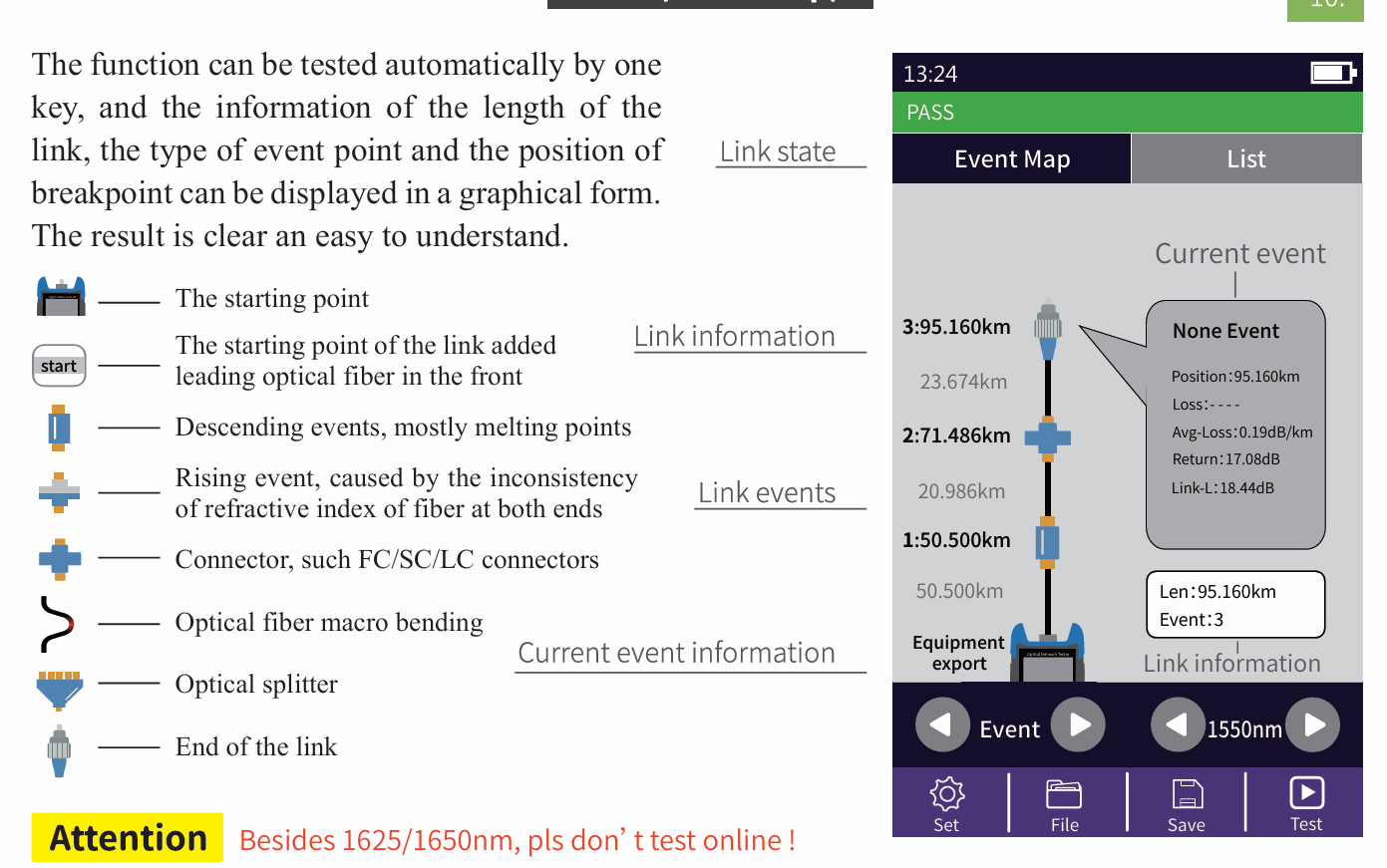 fiber with your eyes, avoid eye damage! Except for 1625nm/1650nm, all the others are non-on-line test